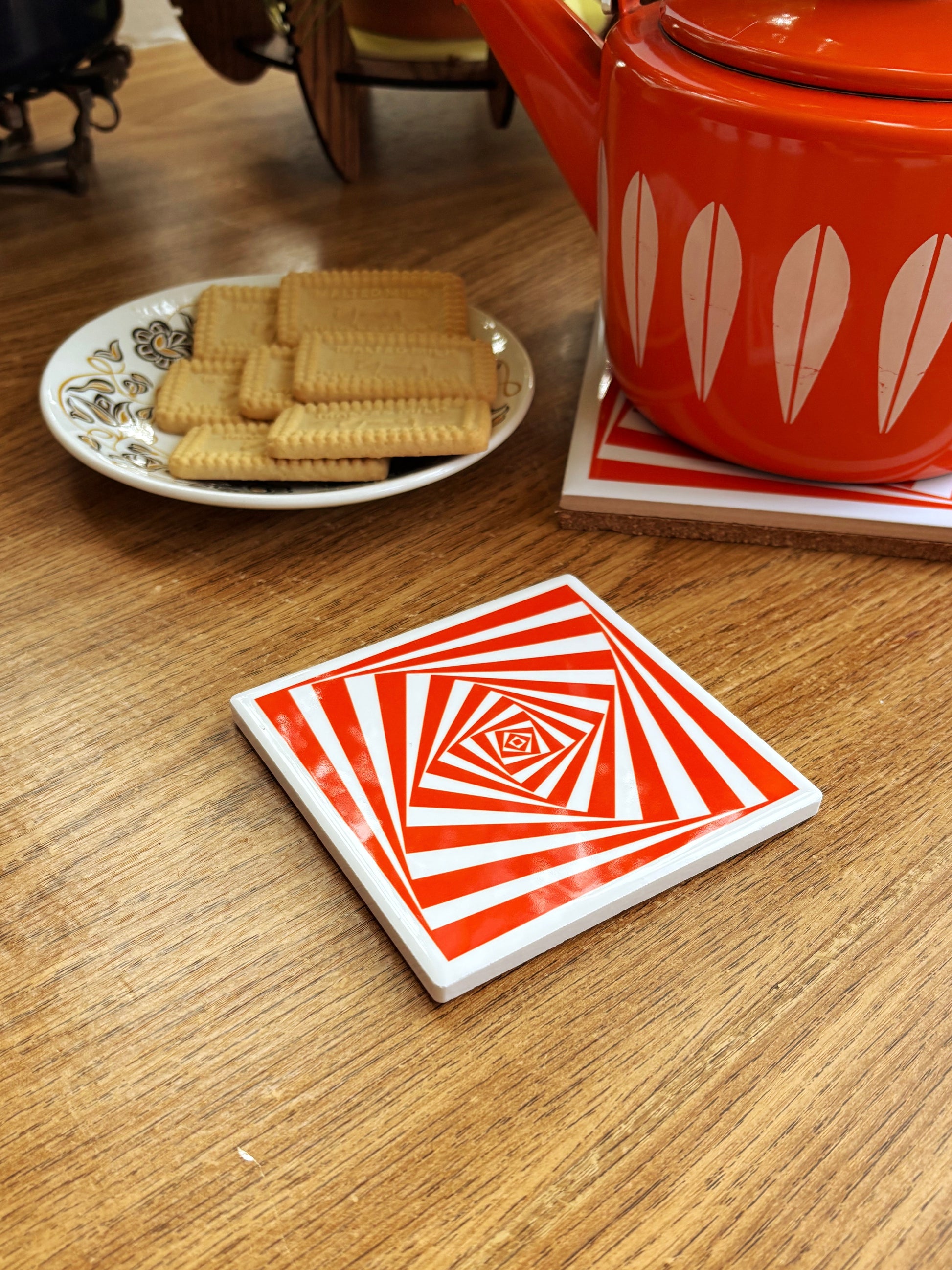 Inspired by artists of the 60s Op Art movement. Using monochromatic geometric patterns to trick the eye, our Op Art coasters are a functional piece of art for your home.