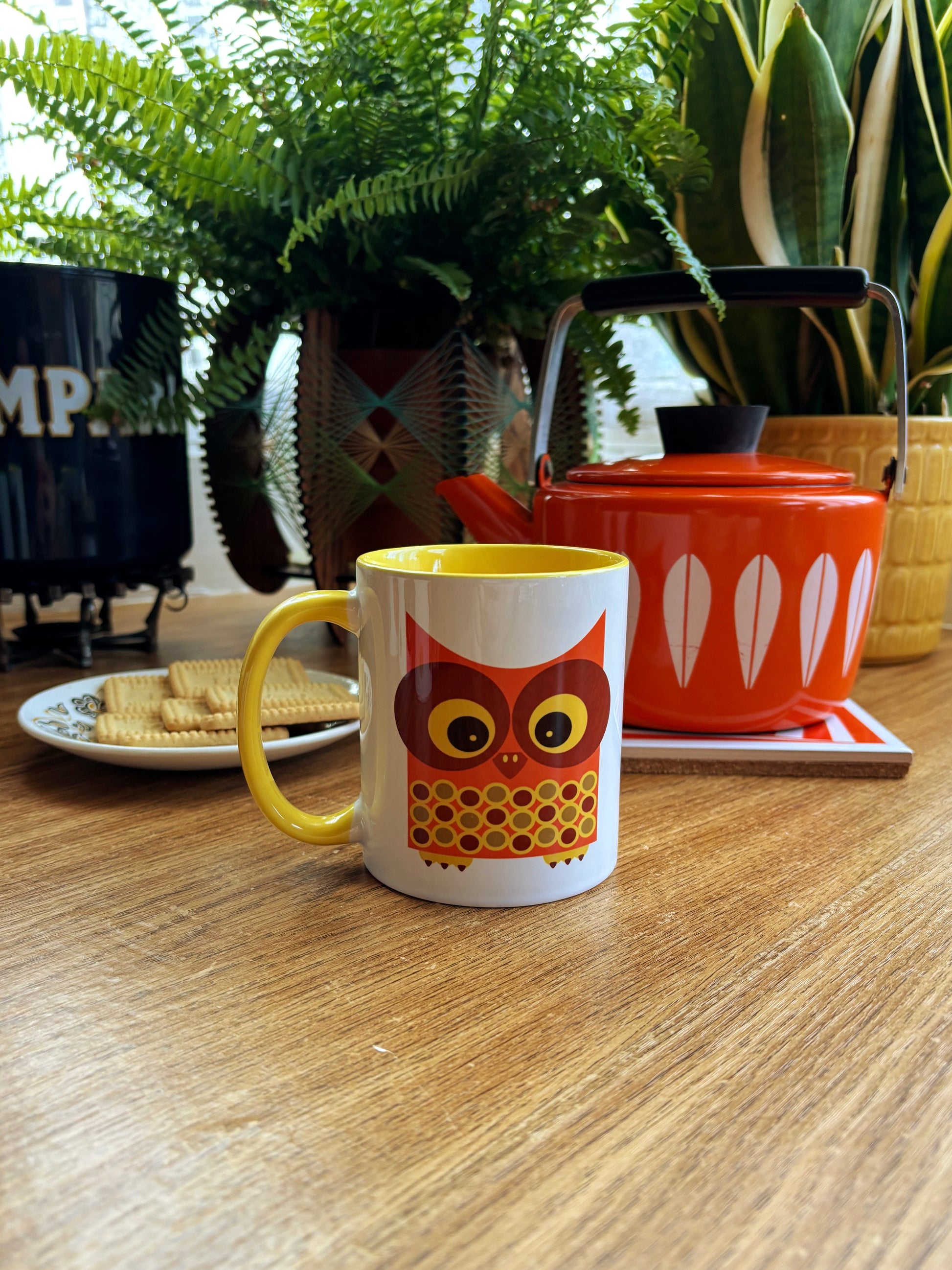 Our cute Wally The Owl design on a fab ceramic mug. Wally was inspired by a 70s fabric pattern!