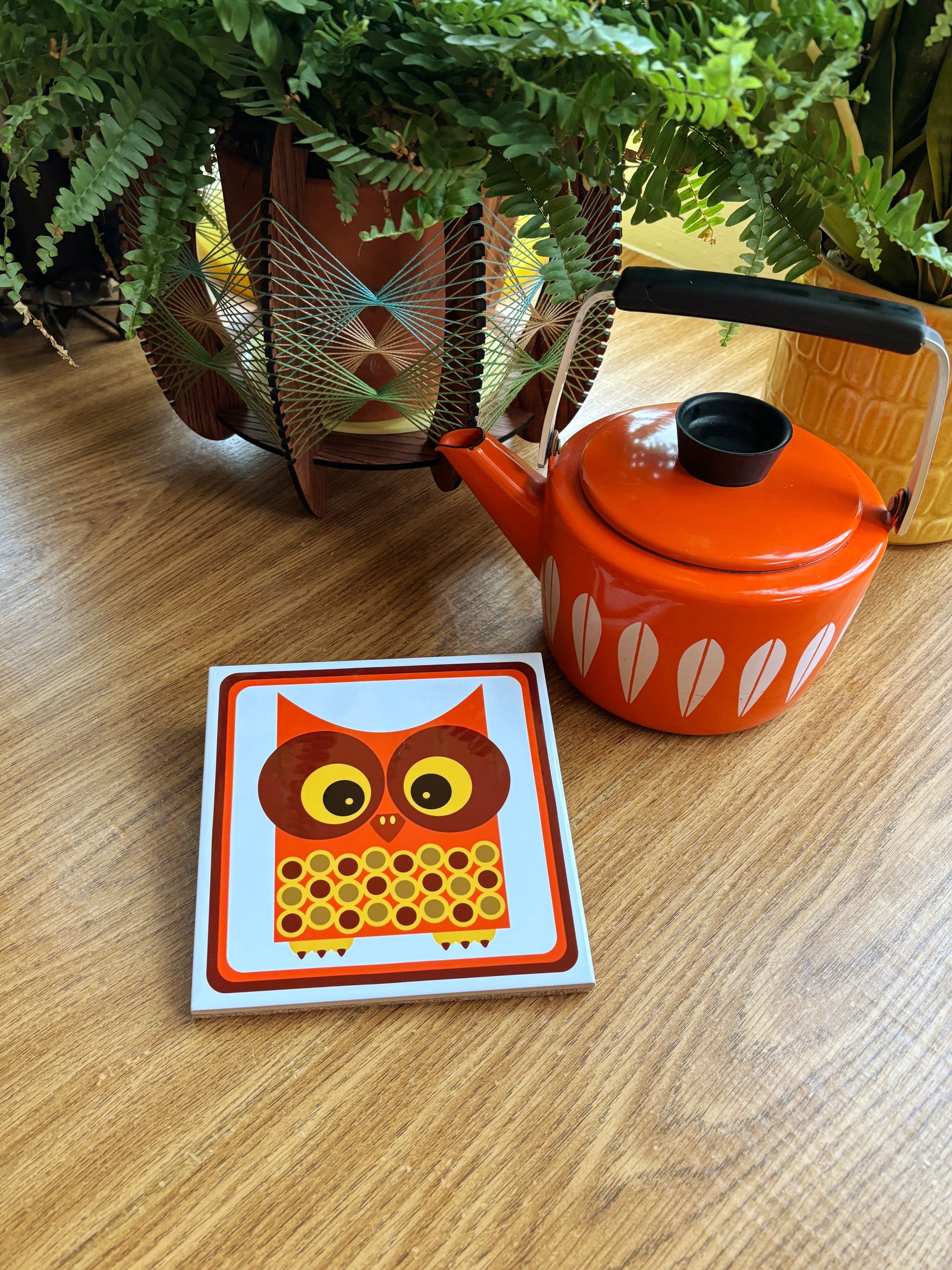 Our cute Wally The Owl design on a beautiful and functional trivet! Perfect for use in the kitchen as a pot stand, or anywhere else in the home! Wally was inspired by a 70s fabric pattern!